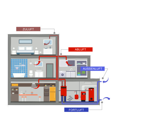 Použitý vzduch (odsávaný vzduch) sa odvádza z miestností, v ktorých sa používa voda, ako je kuchyňa, kúpeľňa a WC, a smeruje do komfortného vetrania. Základom vetrania obytných priestorov HomeVent je rekuperácia tepla a vlhkosti, pri ktorej sa teplo z odvádzaného vzduchu odovzdáva čerstvému, filtrovanému vonkajšiemu vzduchu. V tomto procese sa rekuperuje približne 85% tepla, ako aj molekuly vody obsiahnuté vo vzduchu. Týmto spôsobom sa zachováva teplo a vlhkosť vzduchu, ktoré sú dôležité pre zdravú vnútornú klímu. V samostatných kanáloch odvádza ventilačný systém použitý vzduch von (odvádzaný vzduch). Čerstvý vzduch (prívodný vzduch) ohriaty systémom HomeVent sa privádza do obytných, pracovných a spacích priestorov prostredníctvom distribučného systému s diskrétnymi vetracími mriežkami.